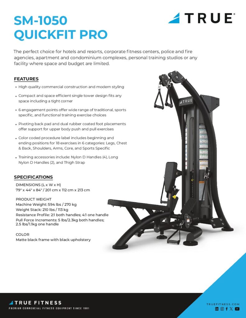 Featuring modern styling, high-quality commercial construction, and a compact and space-efficient footprint, the multi-purpose Quickfit Pro 1050 by TRUE is the perfect choice for hotels and resorts, corporate fitness centers, police and fire agencies, apartment and condominium complexes, personal training studios, or any facility where space and budget are limited.