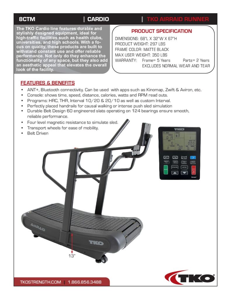 The TKO AirRaid Runner is a high-intensity fitness solution designed for athletes and fitness enthusiasts who demand more from their exercise equipment. This self-powered treadmill features an impact-reducing curved running surface and advanced training programs to offer unparalleled resistance and performance. Its commercial-grade construction ensures reliability in various fitness environments, making it a preferred choice from home gyms to large fitness centers.