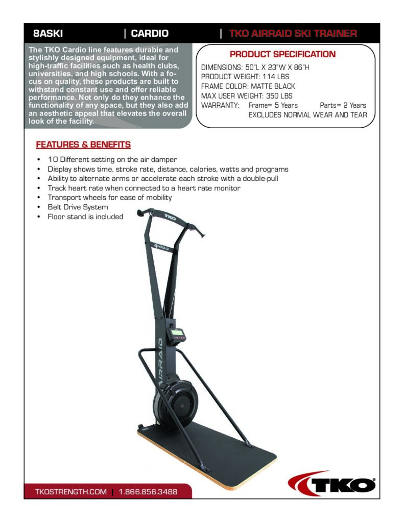 The TKO AirRaid Ski Trainer pushes the boundaries of indoor cardiovascular equipment by integrating commercial-grade durability with a compact air resistance system. Ideal for CrossFit, HIIT, and endurance training, its elegant design complements its efficient performance, making it a must-have for any fitness enthusiast striving to enhance their training regimen.