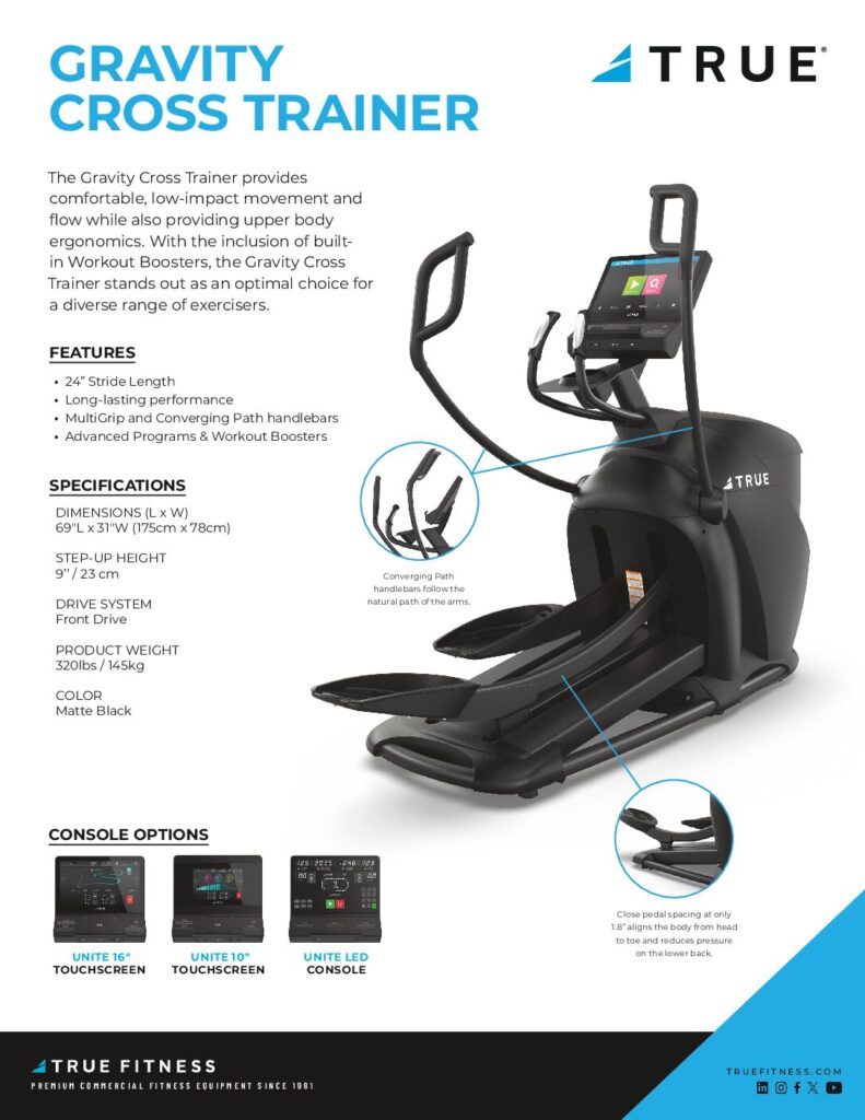 The Gravity Cross Trainer provides comfortable, low-impact movement and flow while also providing upper-body ergonomics. With the inclusion of built-in Workout Boosters, the Gravity Cross Trainer stands out as an optimal choice for a diverse range of exercisers. Customize to both your facility and your users with three UNITE console options. Features: 24” Stride Length Long-Lasting Performance MultiGrip and Converging Path Handlebars Advanced Programs & Workout Boosters